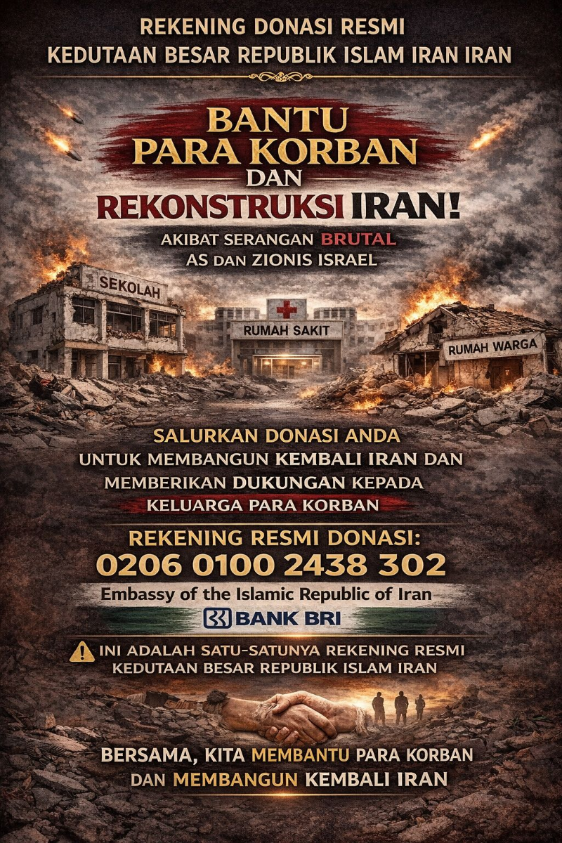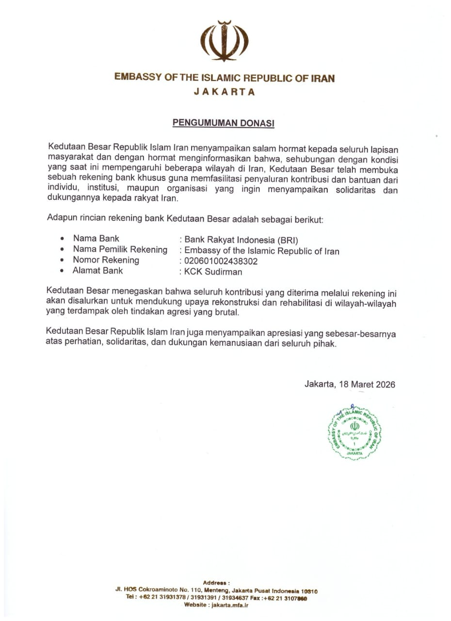 The Embassy of the Islamic Republic of Iran in Jakarta has announced the opening of a donation account to channel humanitarian assistance to affected areas in Iran. Contributions can be made through Bank Rakyat Indonesia (BRI) under the name “Embassy of the Islamic Republic of Iran” with account number 020601002438302. All collected funds will be allocated to support reconstruction and rehabilitation efforts. The Embassy expresses its sincere appreciation for the solidarity and humanitarian support extended by the public. For further information please contact 6221 31931378/31931391.